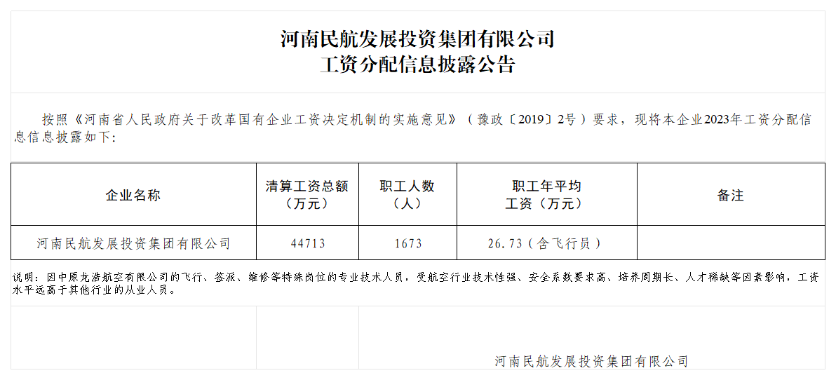 河南民航發展投資集團有限公司2023年度工資分配信息披露